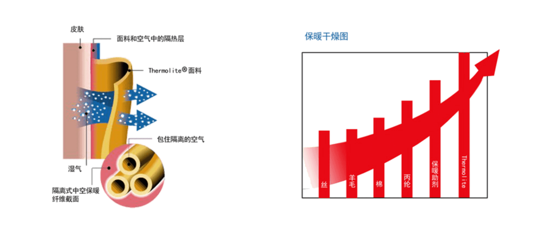 THERMOLITE?采用“隔離式保暖”設計。它仿造北極熊毛的中空特殊結構,可在寒冷的天氣里保持溫暖,即使在濕狀態下也具有保暖和舒適、輕盈的感覺。